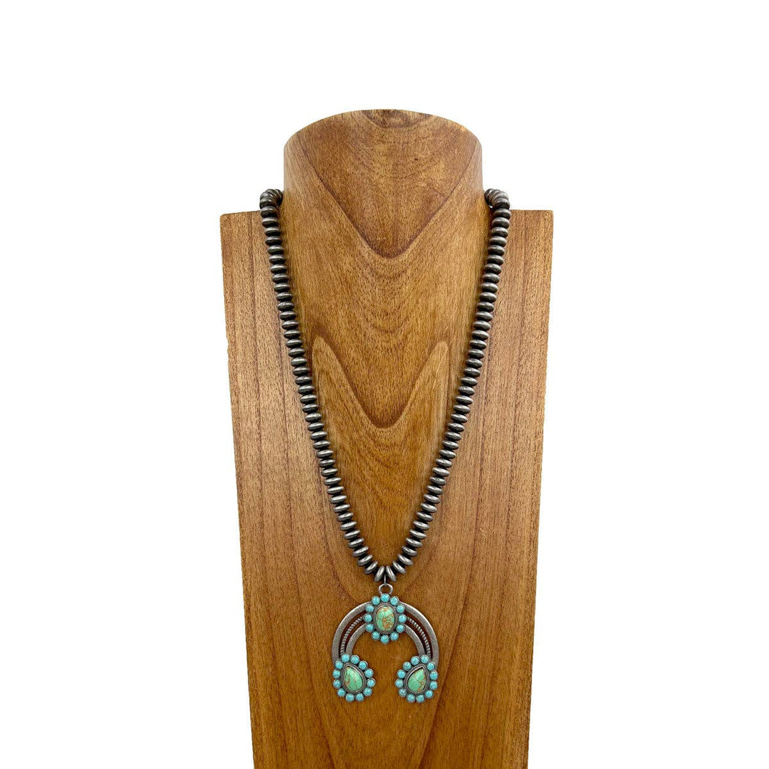 22 inches Roundel silver pearl beads with blue turquoise and green stone squash blossom Necklace