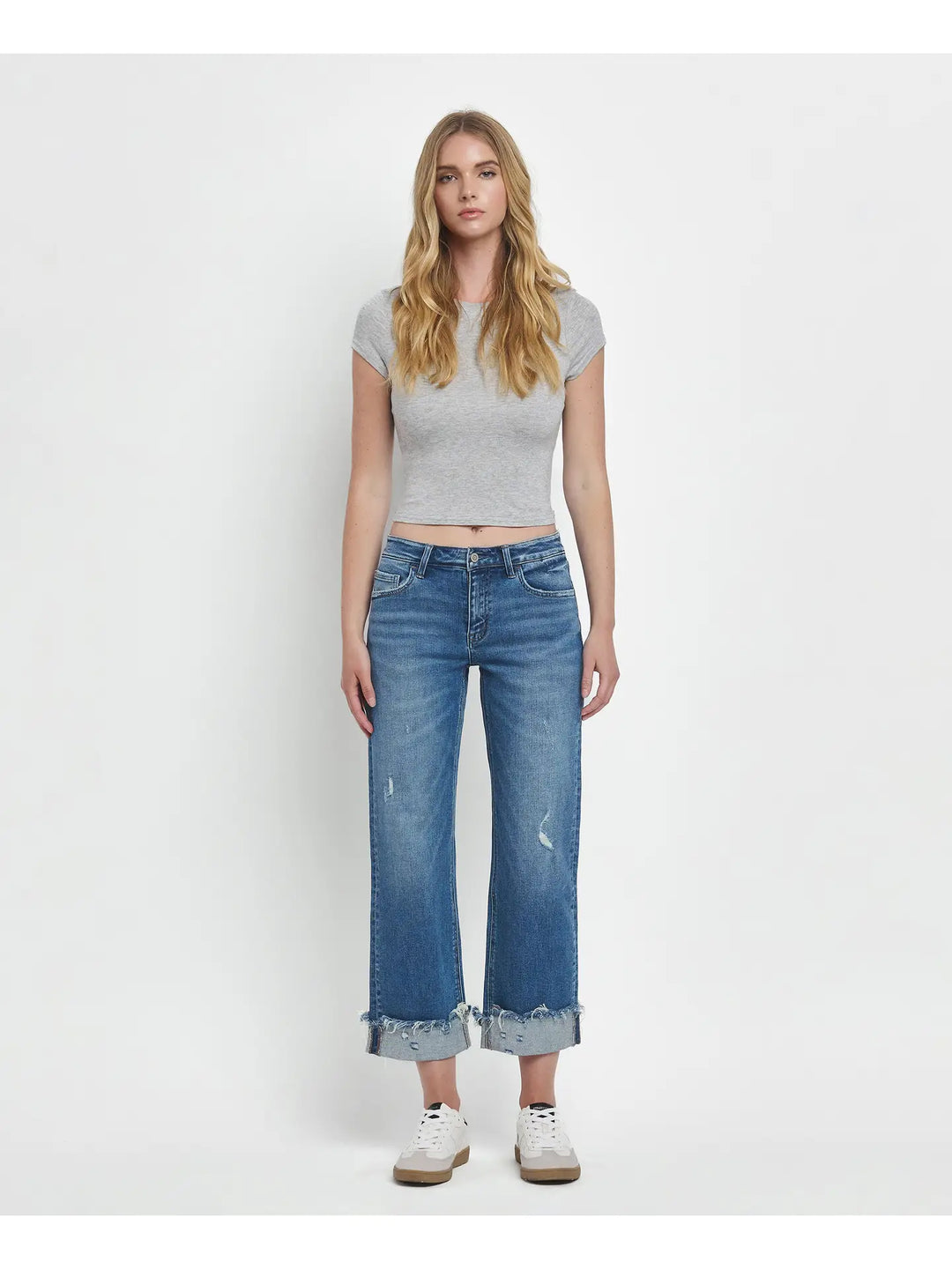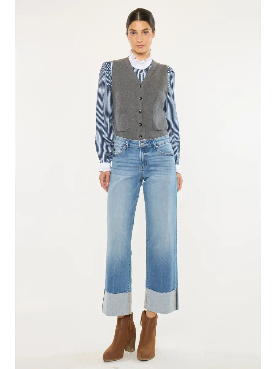Mid Rise Raw Cuffed Hem Slim Wide Jeans