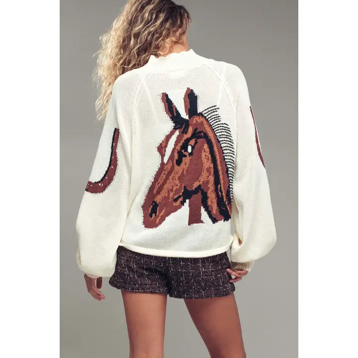Western Horse Graphic Ribbed Trim Crew Neck Cardigan