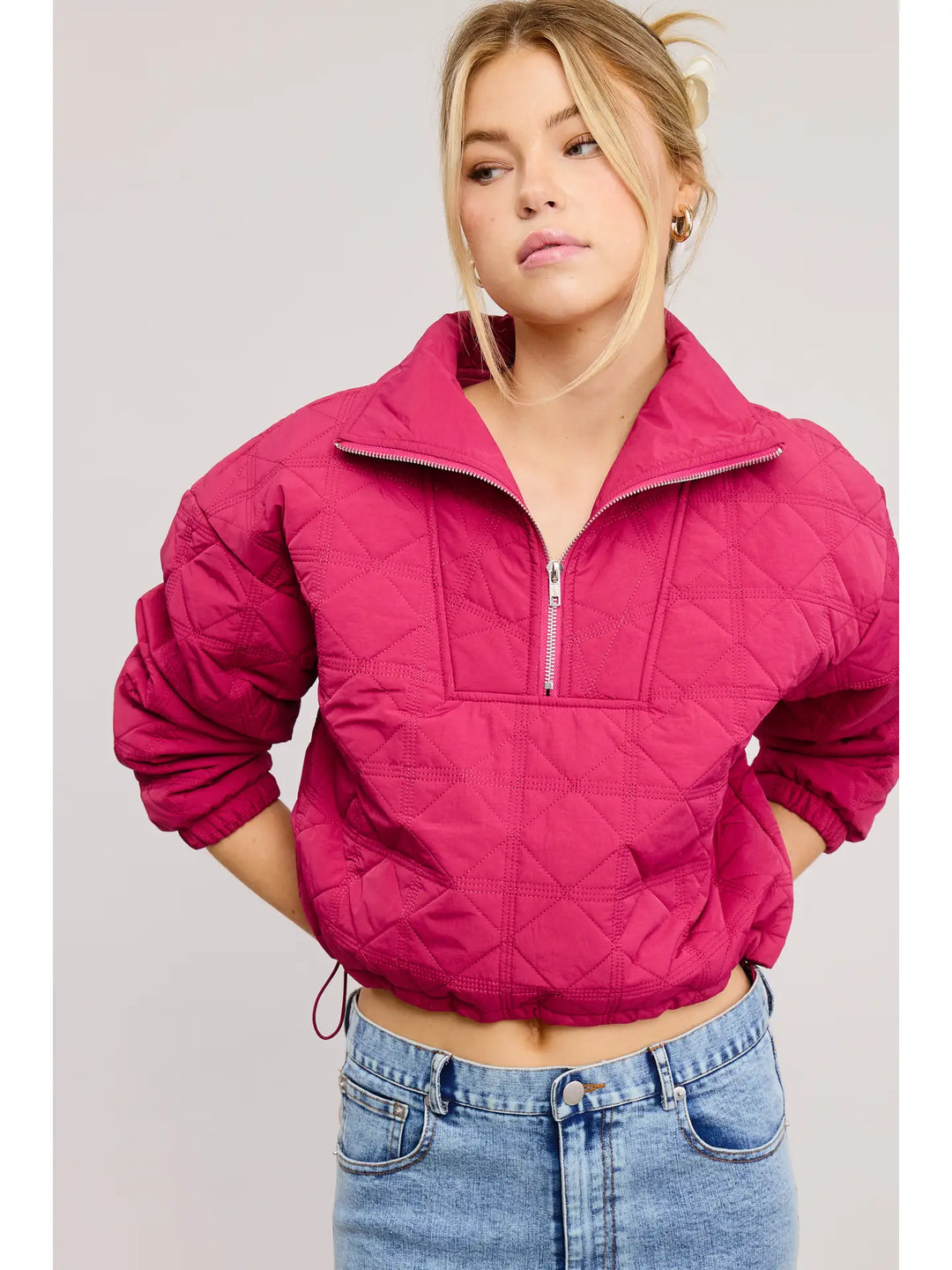 Quilted Puffer Sweater with Collared Zipper-Pink