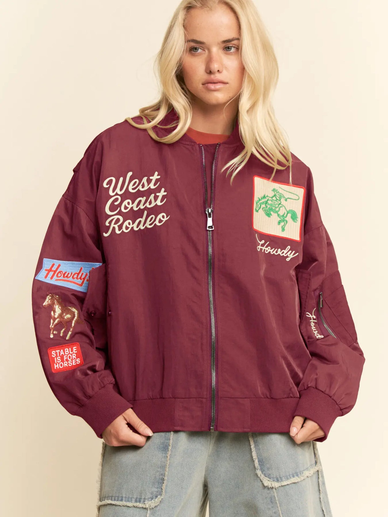 Western-inspired bomber jacket with bold cowboy embroidery and "West Coast Rodeo" lettering. Lightweight nylon shell with ribbed cuffs and hem, zip front, side pockets, and sleeve pocket. Available in Olive Green and Black. Perfect statement piece for boutiques, festival fashion, and streetwear collections. Details: Construction: 100% Nylon shell Fit: Oversized bomber fit
