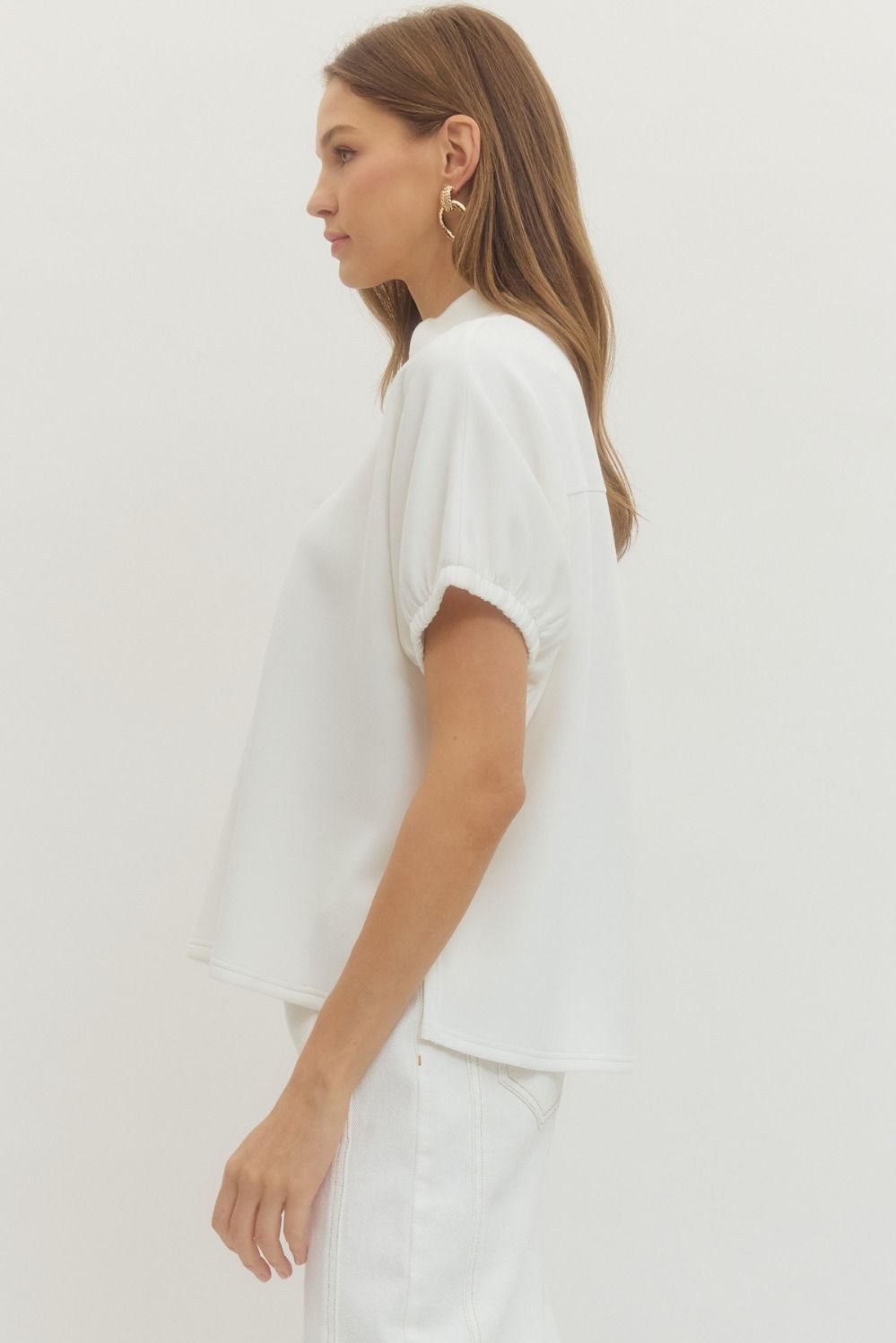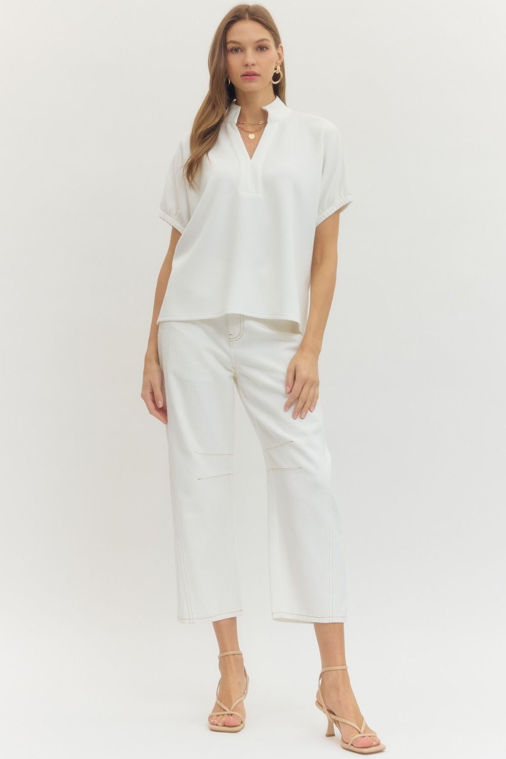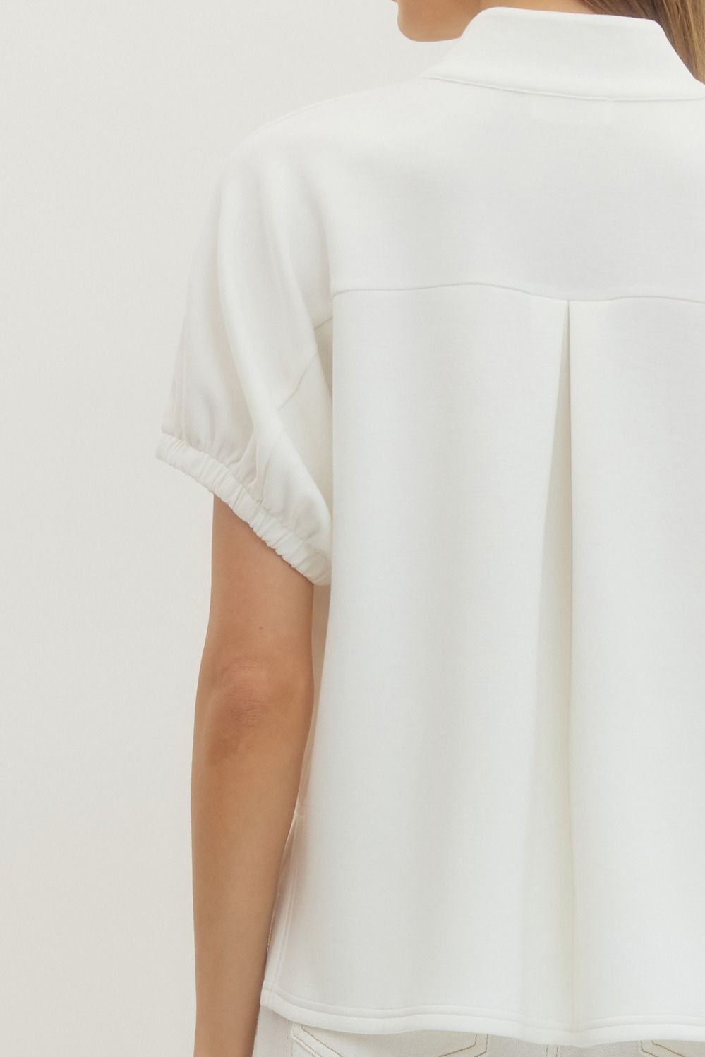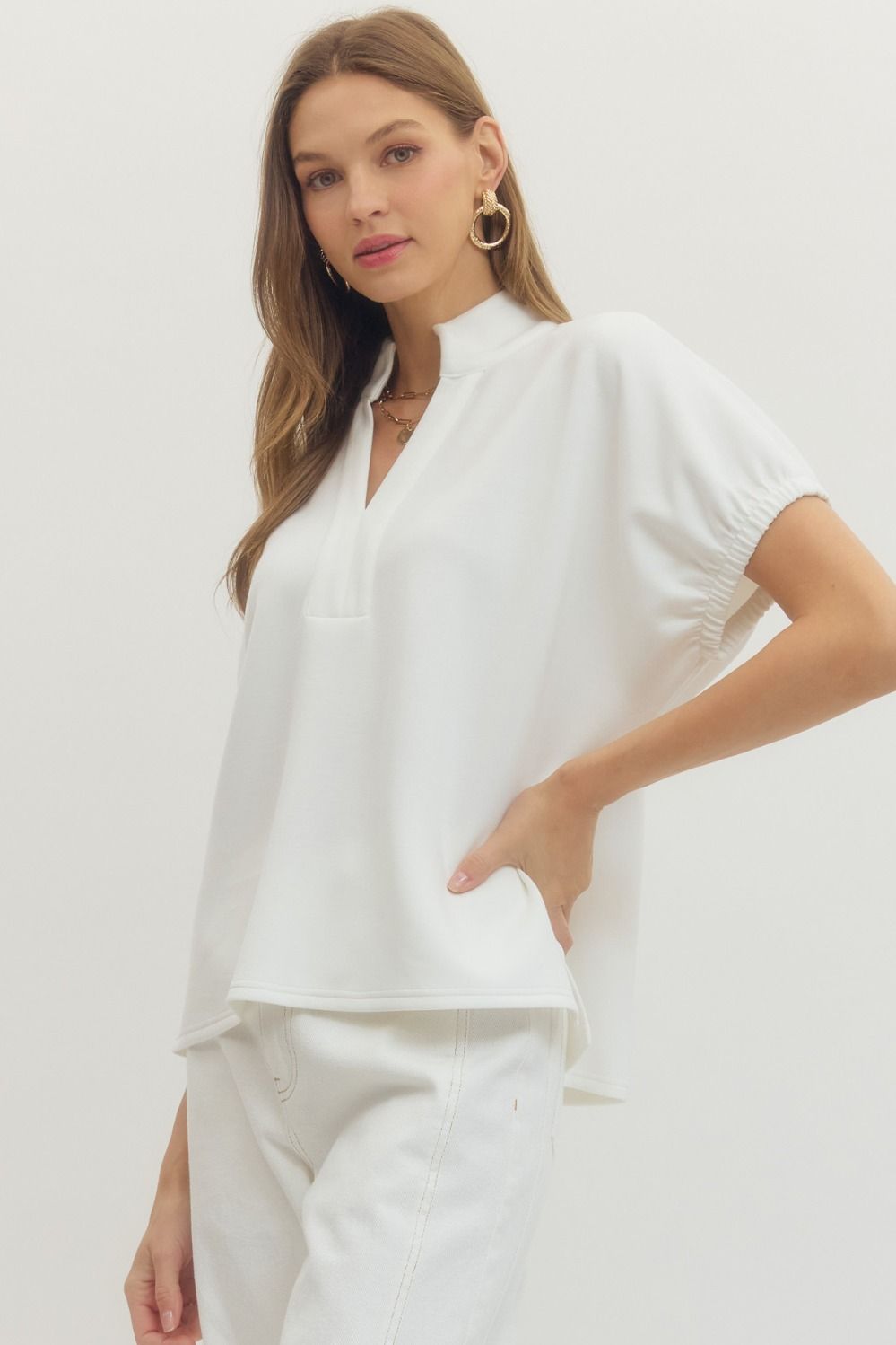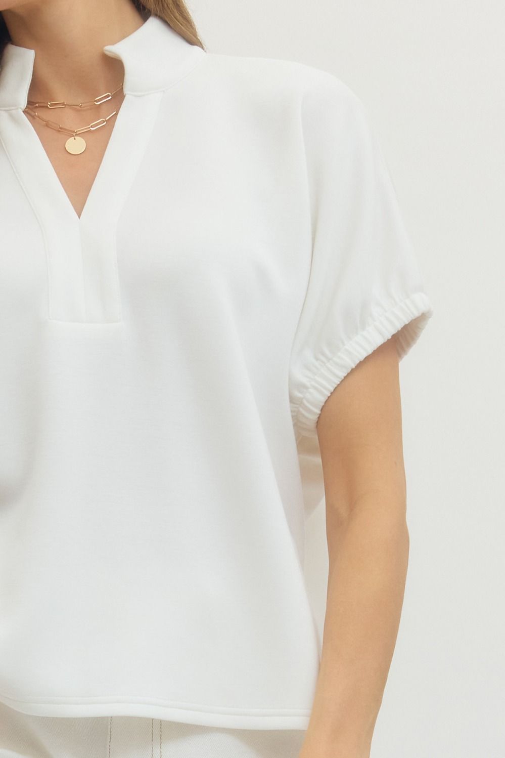 Solid short sleeve top featuring split V-neck with collar band. Elasticated sleeve openings. Back yoke with pleat detail. Unlined. Knit. Non-sheer. Lightweight.