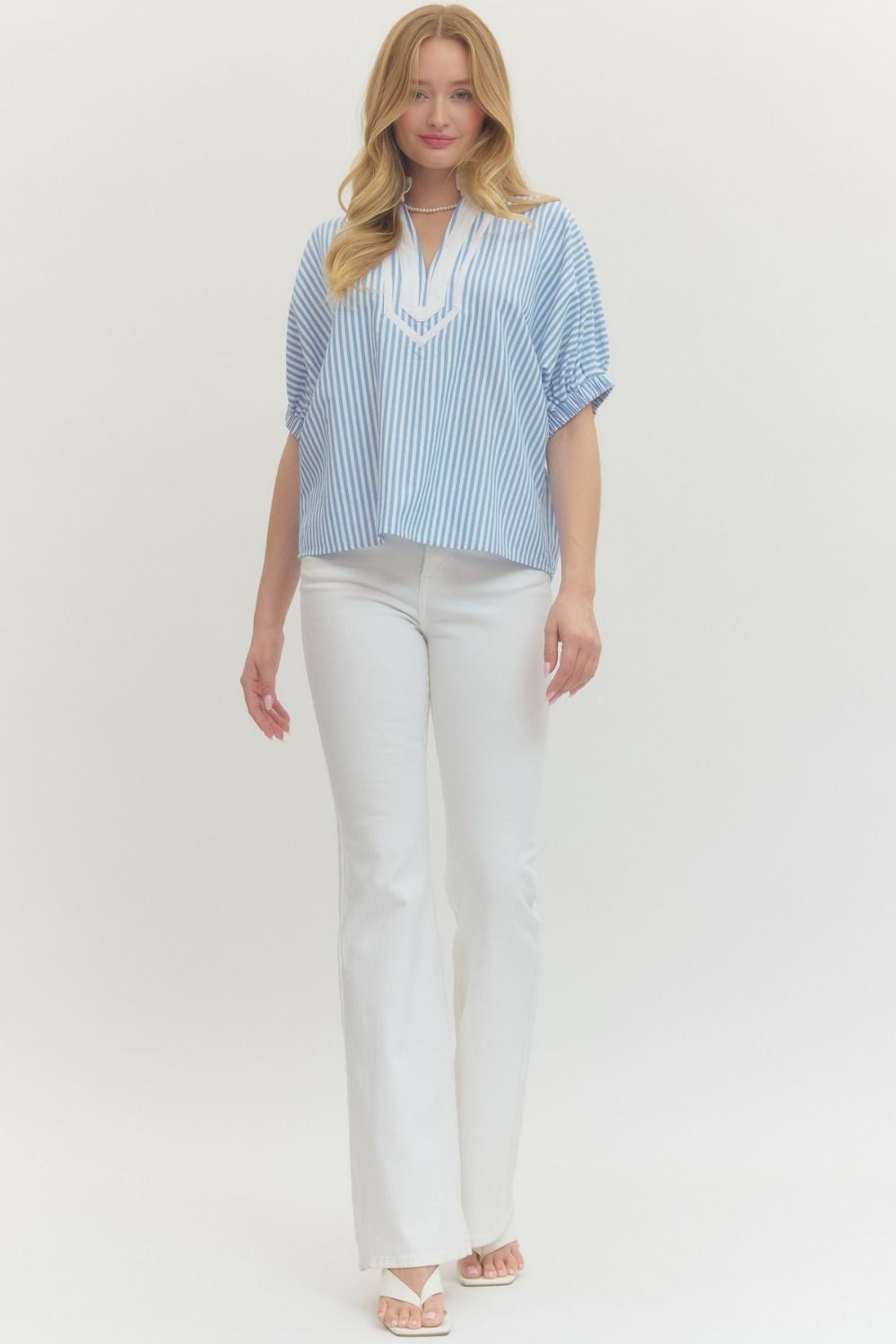 Striped short dolman sleeve top featuring contrast V-neck panel detail. Unlined. Woven. Non-sheer. Lightweight.