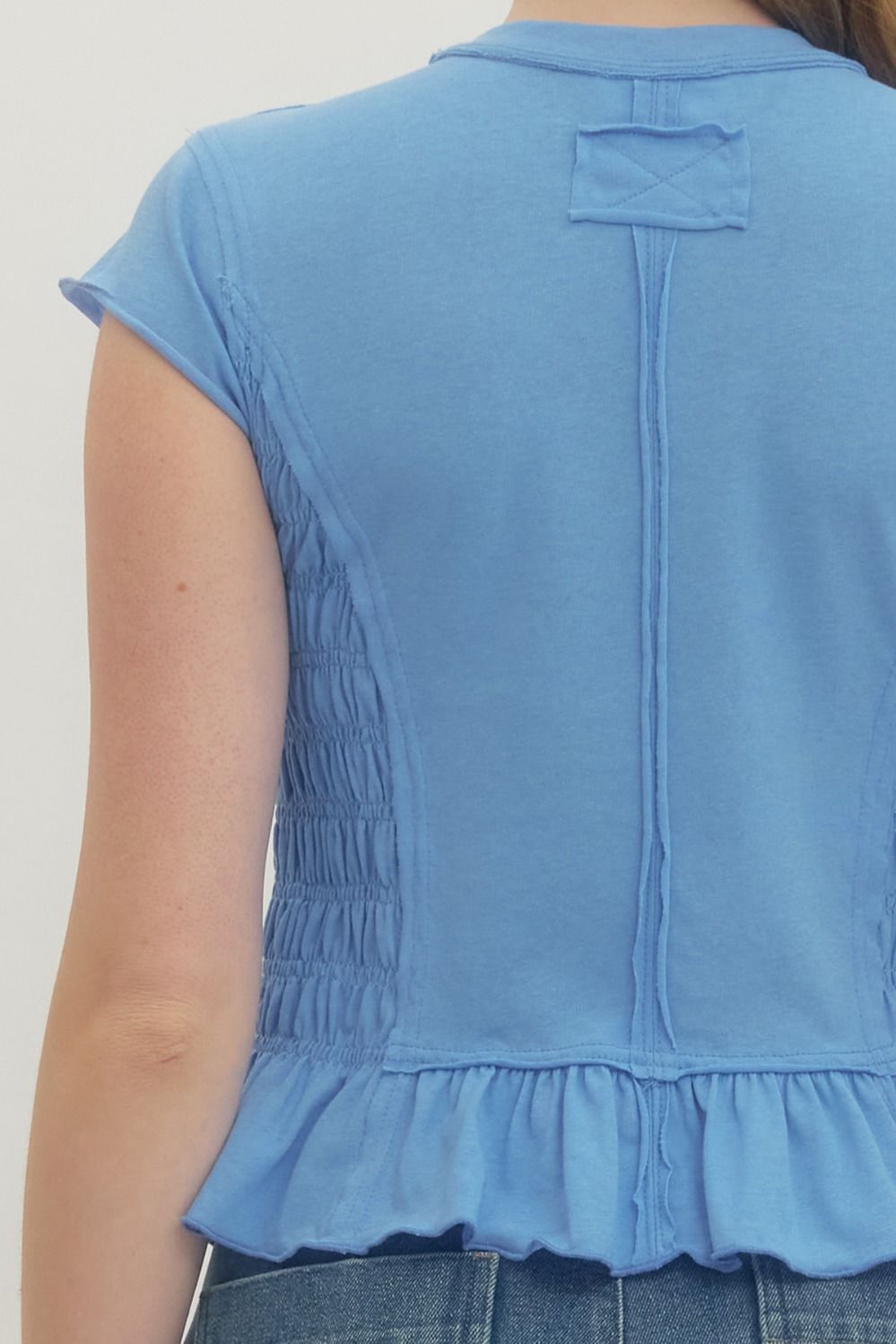 Solid short sleeve top featuring smocked bodice and ruffle hem. Exposed seam detail at back with stitched square accent below neckline. Unlined. Knit. Non-sheer. Lightweight.