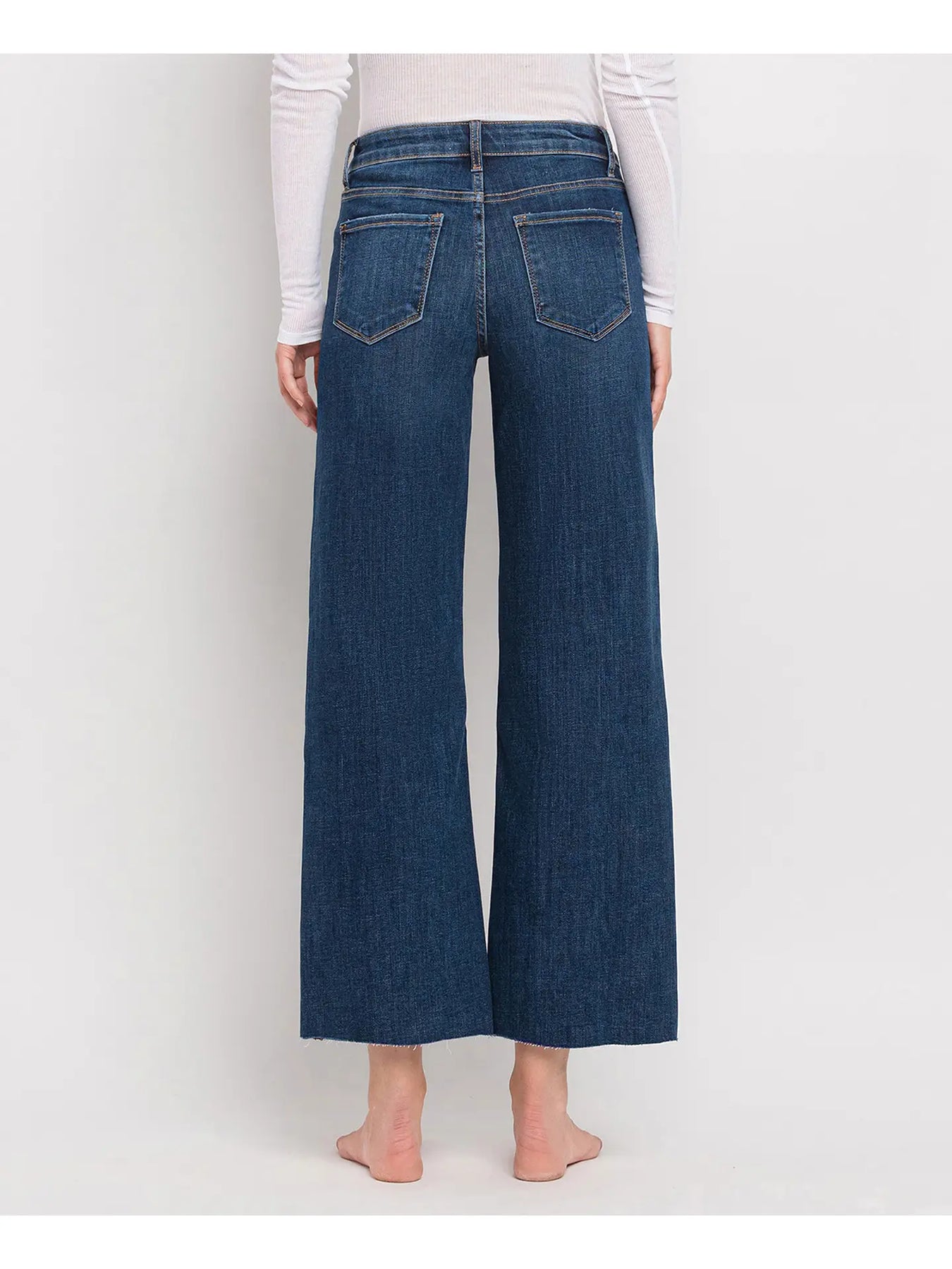 Tummy control mid rise dark wash wide leg jeans Comfort stretch denim, mid rise waist, 5 pockets, clean cut raw hem, cropped length, dark wash, wide leg jeans Tummy control feature with inner panels for shaping and smoothing F. Rise: 9 1/2" / inseam: 27 1/2" / leg opening: 20" Model is 5'10" wearing a size 26