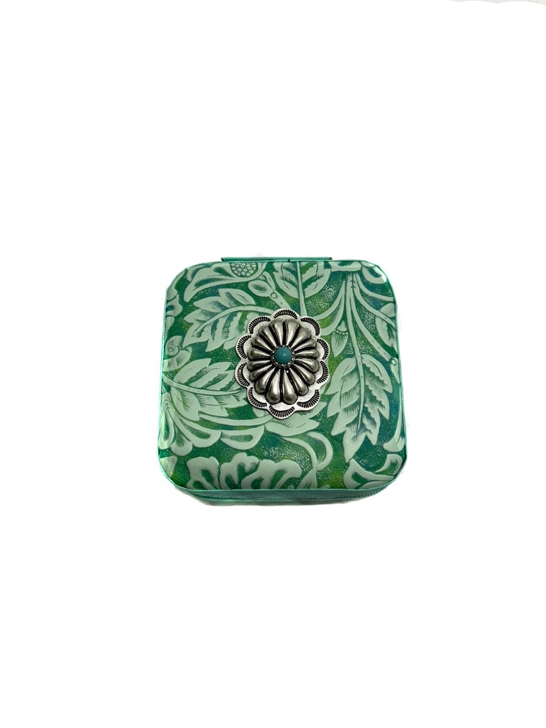 Western Turquoise Concho Jewelry Box WESTERN PATTERN TURQUOISE CONCHO JEWELRY BOX MEASURES : 3.75" X 3.75" X 2 INCHES WITH A SECURE ZIPPER CLOSURE